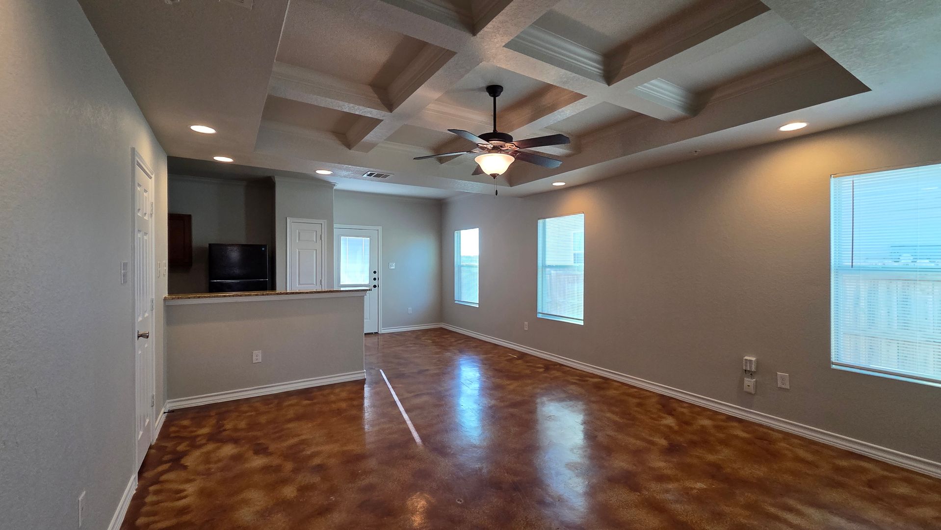 Downstairs offers open living, dining and kitchen with stained concrete flooring with decorative trey ceiling and modern granite kitchen. This is an end unit with bonus windows offering lots of natural light.